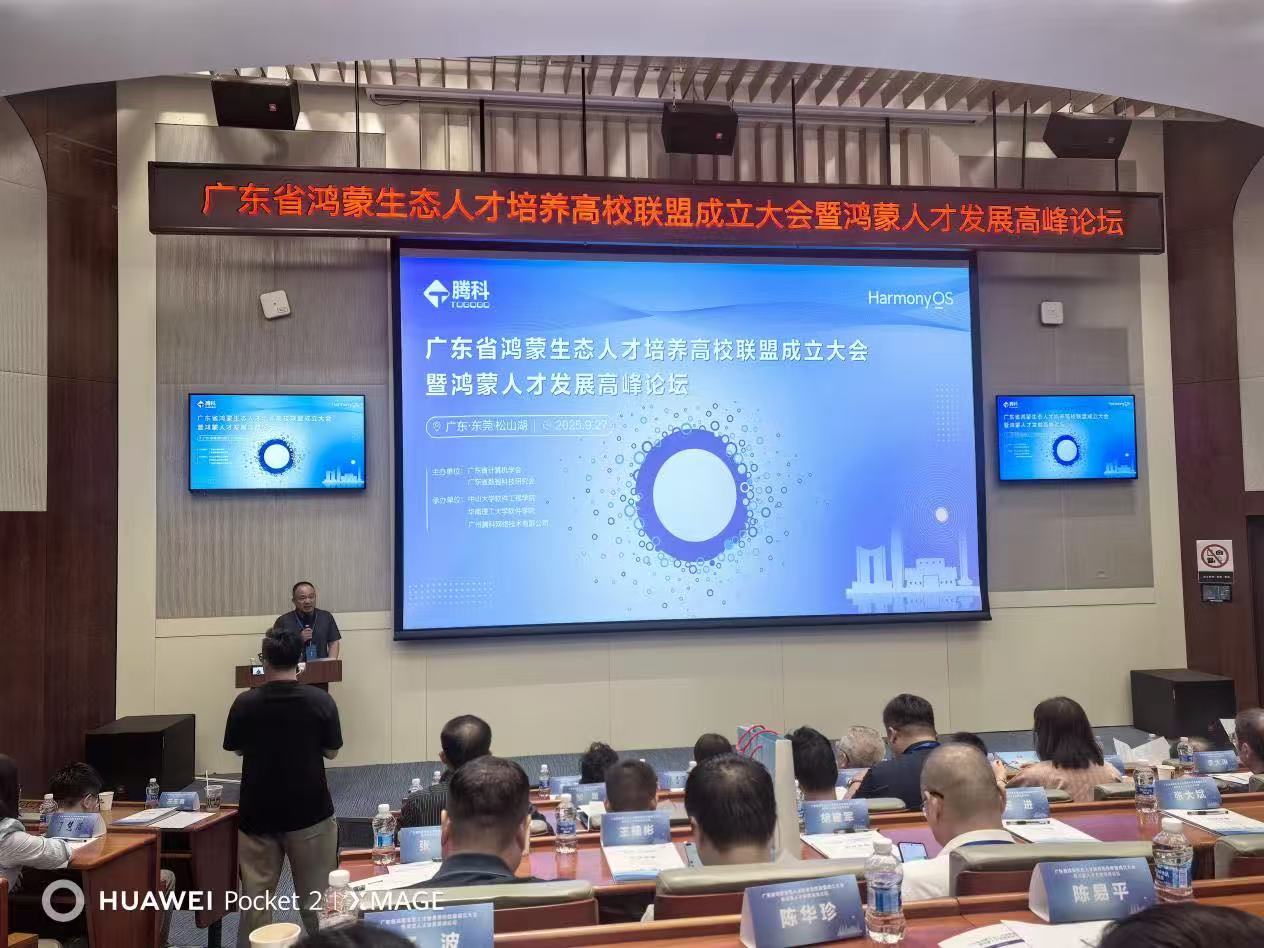 2025年9月27日下午,广东省鸿蒙生态人才培养高校联盟成立大会暨鸿蒙人才发展高峰论坛在东莞市华为松山湖基地成功举办。beat365官网人工智能学院执行院长张伟明率学院教师代表胡纯意一同参会,与来自全省高校、企业及科研院所的专家学者共同探讨鸿蒙生态人才培养的相关议题。
