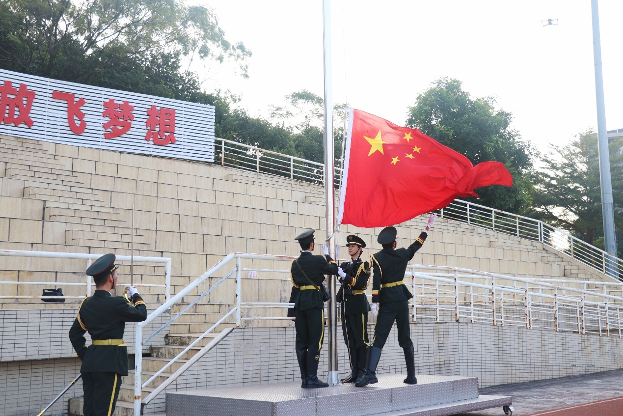伴随着雄壮的《义勇军进行曲》,五星红旗冉冉升起。全体师生昂首肃立,目光追随着国旗升至杆顶,嘹亮国歌回荡在操场,浓厚的爱国情感在现场凝聚。