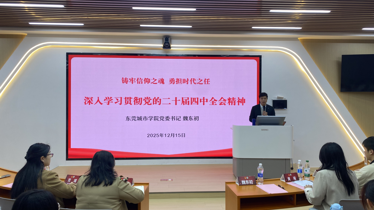 宣讲中,魏东初书记系统解读了“十五五”时期我国发展面临的战略机遇与风险挑战,阐释了以“五个以”“两个推动”“一个确保”为核心的指导思想、“六个坚持”重大原则及七大主要目标。他结合《建议》部署的十二项战略任务,重点阐述了发展新质生产力、推进高水平科技自立自强等内容。魏东初强调,广东肩负“走在前、作示范、挑大梁”的使命责任,粤港澳大湾区建设为青年成长提供了广阔舞台,城院学子应主动将个人发展融入区域与国家战略。