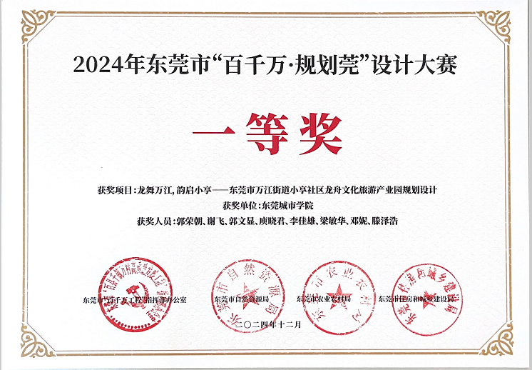 近年来,郭荣朝教授团队深耕乡村振兴发展研究。2024年7-12月,围绕东莞市“百千万 规划莞”设计大赛,该团队多次到东莞市万江街道小享社区调研,提交的“龙舞万江,韵启小享——东莞市万江街道小享社区文化旅游产业园规划设计”作品,一举斩获大赛一等奖。该方案建议被东莞市自然资源局采纳。