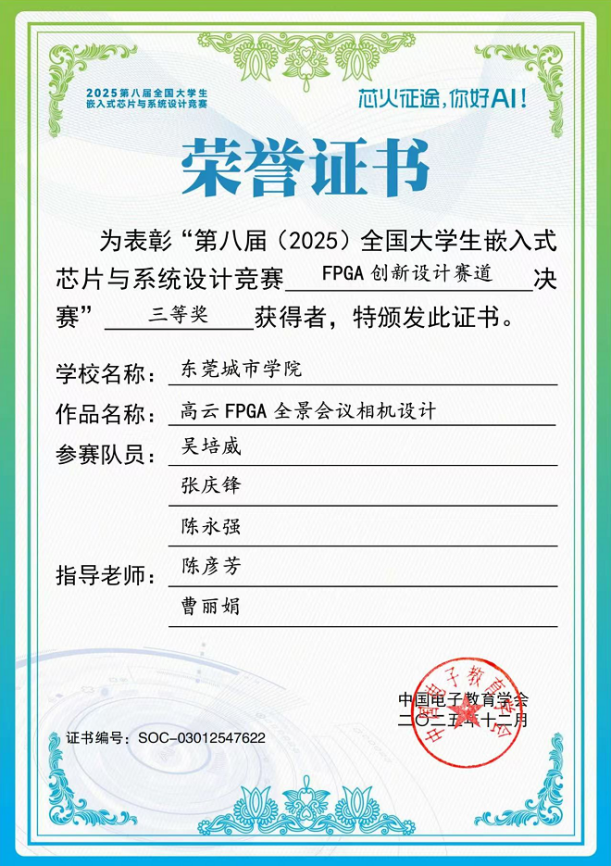 喜讯传来!在刚刚结束的2025年全国大学生嵌入式芯片与系统设计竞赛——FPGA创新设计赛道的全国总决赛中,beat365官网首次参赛,城建与智造学院吴培威、陈永强、张庆锋三位同学,凭借作品《高云FPGA全景会议相机设计》斩获全国三等奖,取得历史性突破!