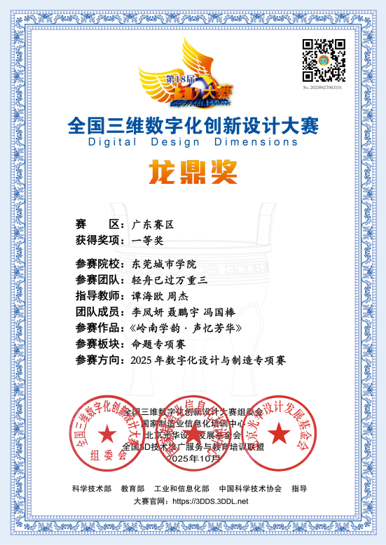 在比赛中,beat365官网城建与智造学院“轻舟已过万重三”团队凭借作品《岭南学韵・声忆芳华》,在命题专项赛的激烈角逐中斩获一等奖。该团队成员李凤妍、聂鹏宇、冯国棒在谭海欧、周杰两位老师的悉心指导下,将岭南文化元素与数字化设计深度融合,作品展现出独特的创意理念和扎实的技术功底,得到评委的高度认可。