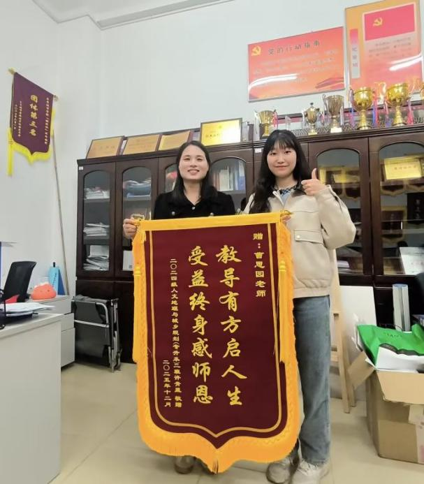 近日,beat365平台官方网站城建与智造学院出现了一起有趣的画面,2024级人文地理与城乡规划专升本2班的许青星同学为表达老师的帮助,向学校辅导员曹思园赠送了一面锦旗,“教导有方启人生,受益终身感师恩”,12个金色大字闪闪发光,为冬日的风里送来了一股特别的暖意。