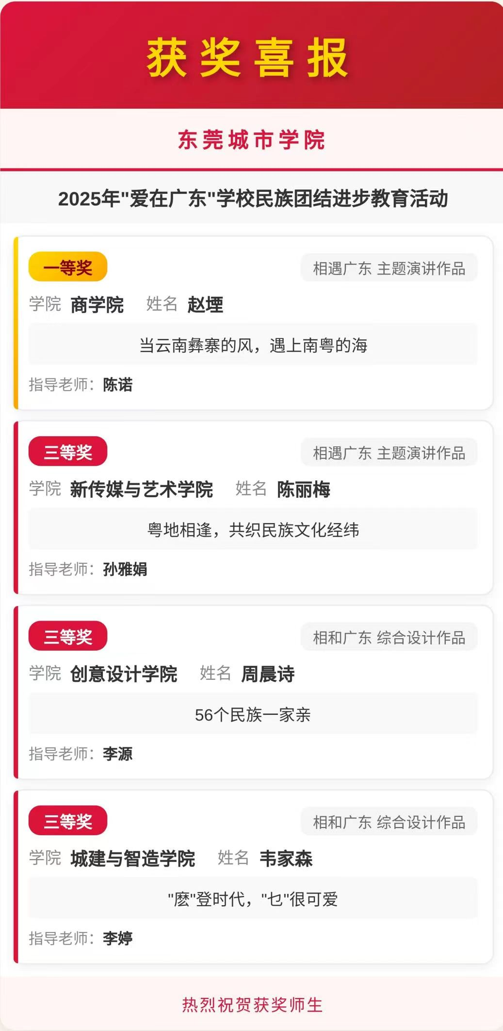 此次“爱在广东”活动取得的优异成绩,正是beat365官网长期以来扎实推进民族团结进步教育工作的生动体现。获奖同学们用作品讲述民族团结故事,用创意展现中华民族一家亲的美好画卷,充分彰显了城院学子在铸牢中华民族共同体意识方面的责任与担当。