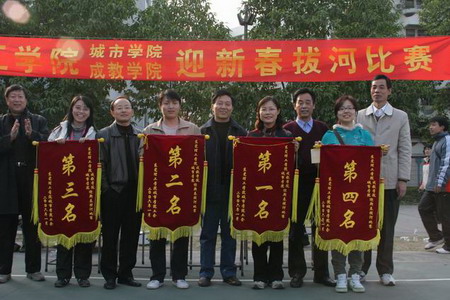 1月9日,我院教工篮球场人声鼎沸,春意盎然。来自城市学院、成教学院8支比赛队伍,在这里展开激烈的拔河比赛。经过三轮淘汰,城市学院机关一队以绝对优势获得第一名,工科队、机关二队、文科队分别获得二、三、四名。学院领导为获奖队颁发了奖旗与奖金。